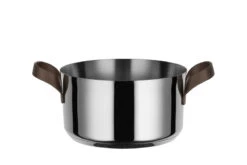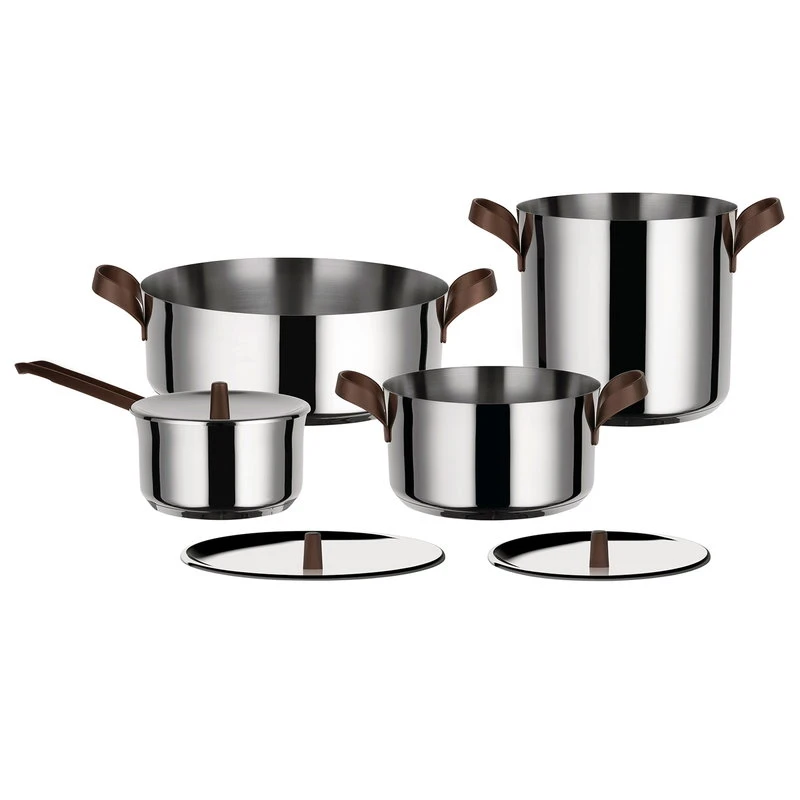 The Edo cookware set by Alessi consists of four stainless steel pots and pans with three lids, including: