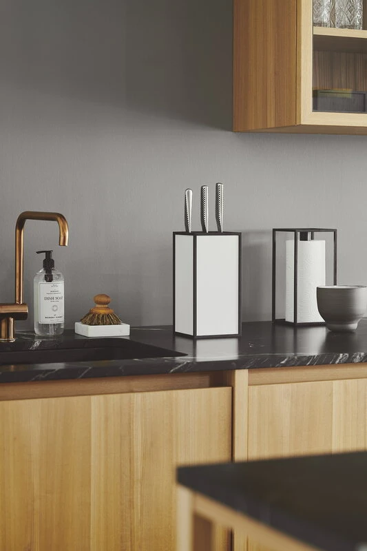 By Lassen’s K’Block knife holder follows the same geometrical design as the brand’s famous, Bauhaus-inspired Kubus collection. The minimalist knife block features a removable, dishwasher-safe insert that makes the holder easy to keep clean and, if the insert is removed completely, allows you to use the block as a storage box for kitchen utensils. The K’Block knife holder was designed by Søren Lassen, the grandson of Kubus creator Mogens Lassen.Â