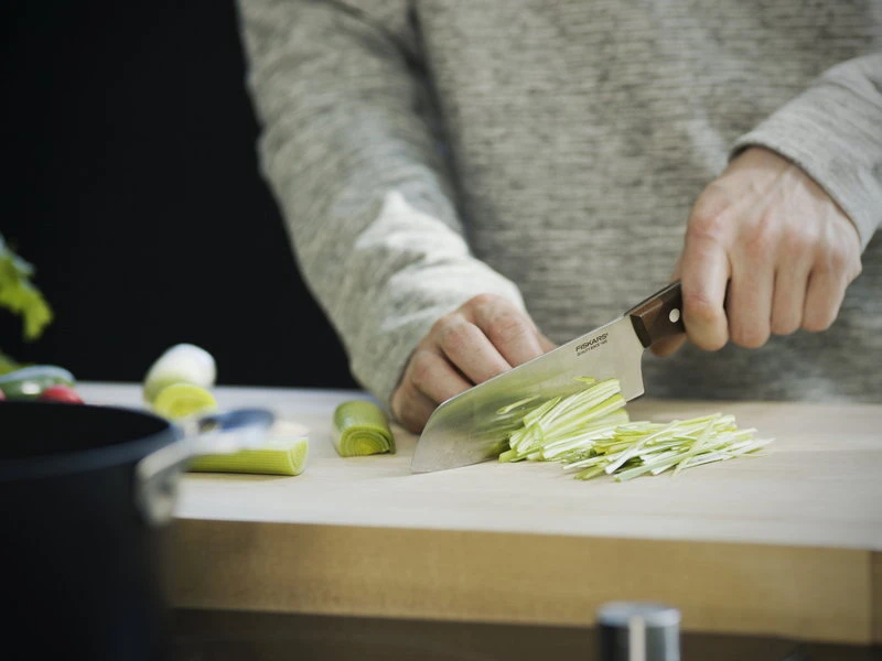 Norr Santoku knife, designed by Jacob Leth-Espensen for Fiskars, combines high quality materials with pleasant, ergonomic design, inspired by traditional Nordic kitchen and culture. The wooden handles are crafted of environmentally friendly FSC certified maple: the innovative Kebony technology gives it a rich brown colour and makes it tougher than teak. The Norr blades are made of German steel with a hardness of HRC 54.