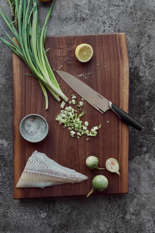Fiskars Titanium chef’s knife comprises a revolutionary sharp, ultra-light titanium blade and ergonomic handle with an excellent grip. Fiskars Titanium knives have been made with a unique LZR-EDGE technology where the edge has been reinforced with titanium carbide particles – tests have shown that these knives stay sharp four times longer than regular steel knives. Fiskars Titanium knives are corrosion free and they have received the highest possible grade in the CATRA knife sharpness test. The design of the Titanium range is both functional and timelessly elegant, and the knives serve in home and professional use alike.