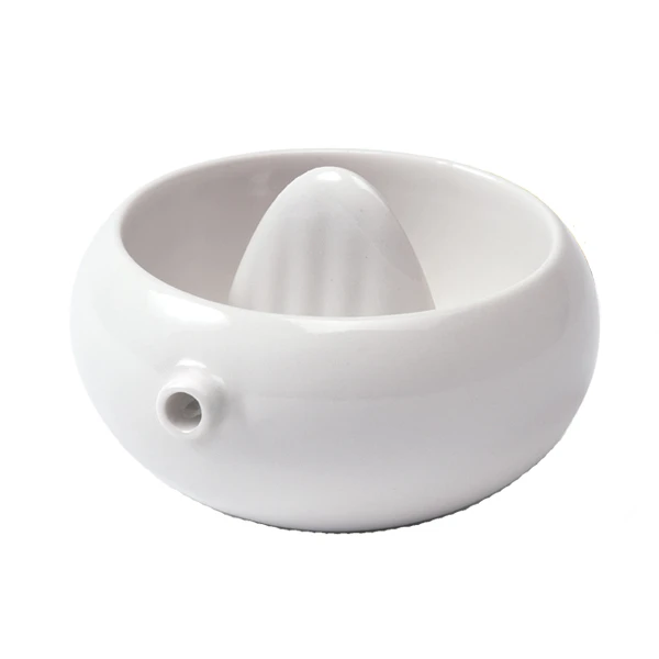 The Oma lemon squeezer by Tonfisk Design is not intended to be kept away in the kitchen cupboard; you can proudly bring the softly shaped ceramic squeezer to the dinner table to complete the setting. The innovative design and small spout prevent the juice from splashing and keep the seeds inside the squeezer.